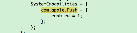 - 工程根目录的xcodeproj包中,右键显示包内容,找到了project.pbxproj,其中有个com.apple.push的值,开启推送时是1,关闭变成了0。估计这个是那个开关的配置文件;