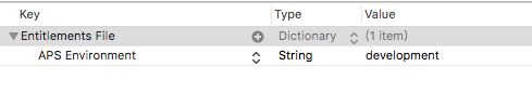 - Code Signing Entitlements配置的那个entitlements文件中,打开推送开关配置时,会自动生成一个APS Environment键值,这是iOS10推出之后,SDK新要求的一个配置权限的地方,这个键值就是推送的配置,关闭的时候,这个被删掉了。
