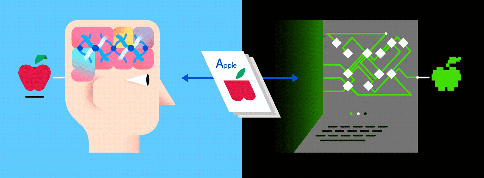 假设这个标签数据分别由苹果和橘子的图片组成。照片是数据;“苹果”和“橘子”是标签。当输入图像数据时,网络将它们分解为最基本的组件,即边缘、纹理和形状。当图像数据在网络中传递时,这些基本组件被组合以形成更抽象的概念,即曲线和不同的颜色,这些元素在进一步组合时,就开始看起来像茎、整个的橘子,或是绿色和红色的苹果。
