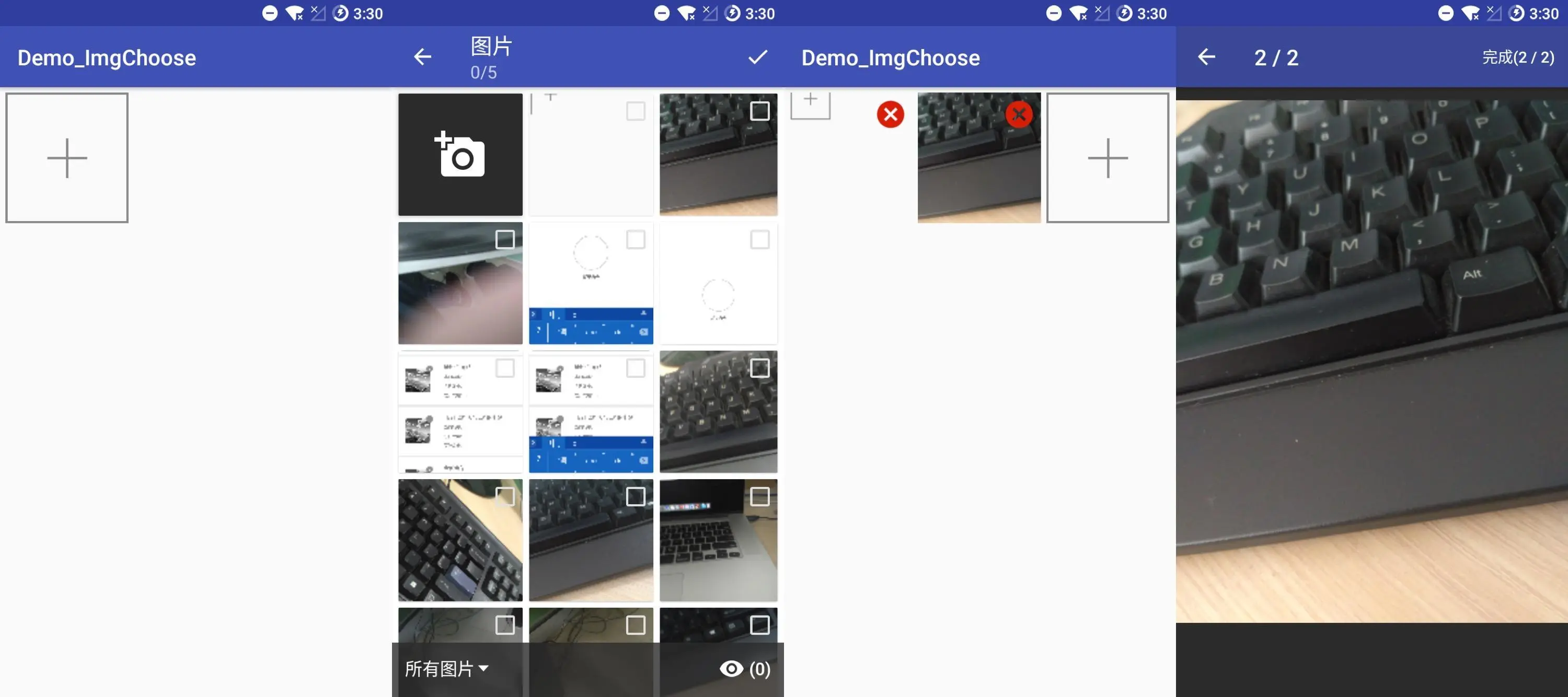 简单来说就是点击加号可以新增或拍照,拍照后可直接返回到主页面直接更新图片。可以控制选择的图片数量,主题,以及预览等等。
