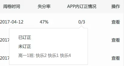 图示:这样一整个列表,当我们鼠标放到订正情况上时候需要显示订正情况的详细信息,而有时我们鼠标滑过的时候可能把每一条的逻辑都触发,但是这并不是我们想要的,我们只想最后鼠标留在哪条数据上,才显示哪一段数据的逻辑,所以根据情况的分析,我们这种情况适用的是函数去抖