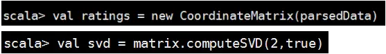 2.将CoordinateMatrix转换为RowMatrix,并调用computeSVD计算评分矩阵的秩为2的奇异值分解: