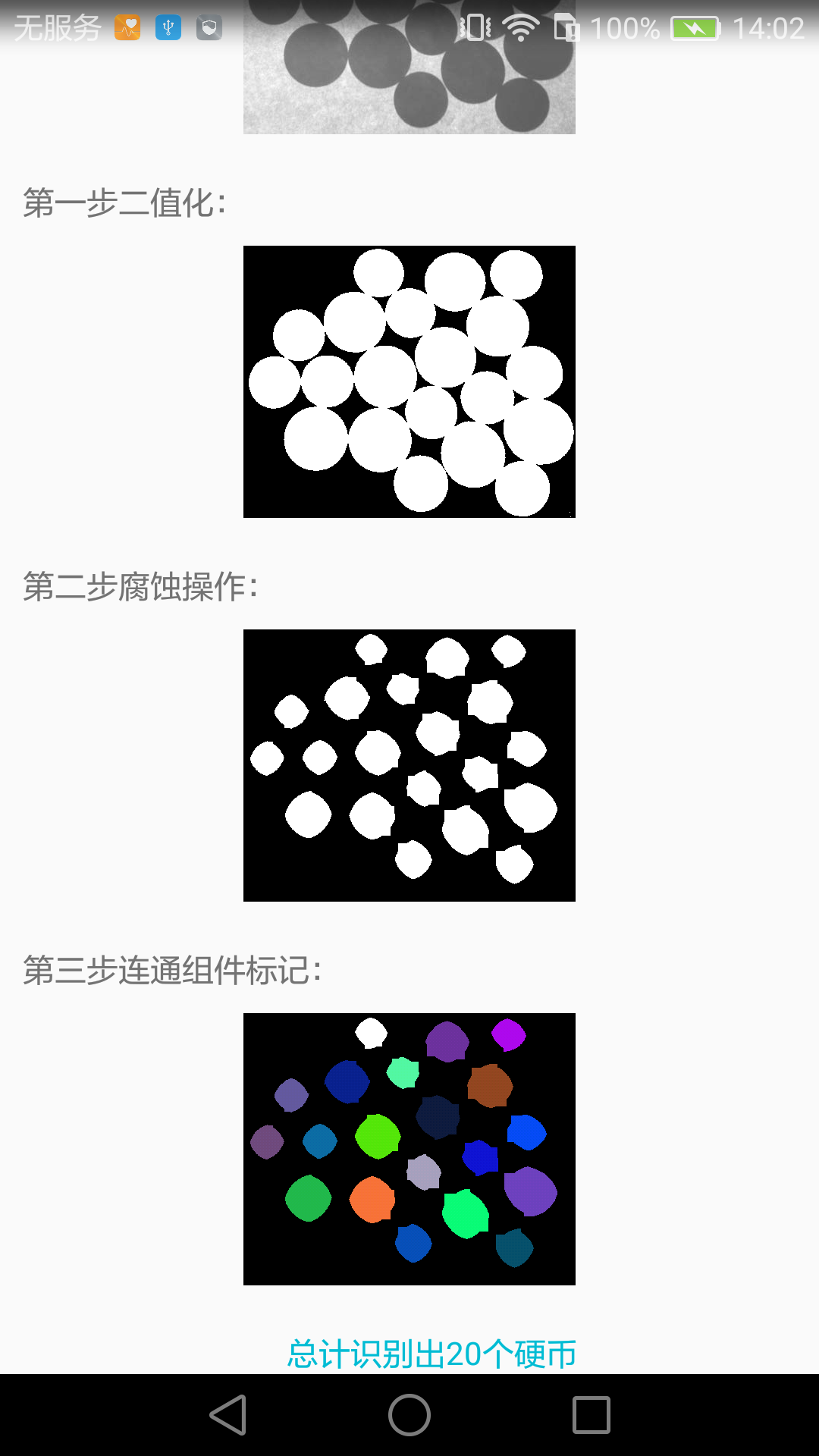 numTextView.setText(String.format("总计识别出%d个硬币",num));最终获取了连通组件的个数也就是硬币的个数,并且在已经识别的硬币上随机着色。