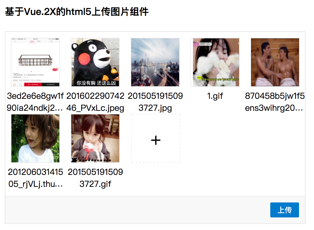 <uploader :src="'/api/imgs'"></uploader>(该组件源码为components文件夹下面的uploader.vue文件, 其余文件是搭建了一个建议的框架和后端配置(为了测试上传进度))