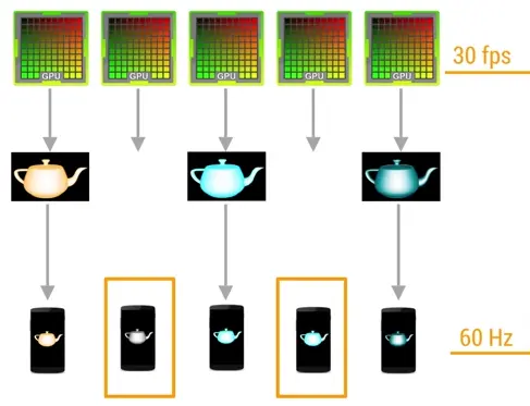 通常来说,帧率超过刷新频率只是一种理想的状况,在超过60fps的情况下,GPU所产生的帧数据会因为等待VSYNC的刷新信息而被Hold住,这样能够保持每次刷新都有实际的新的数据可以显示。但是我们遇到更多的情况是帧率小于刷新频率。