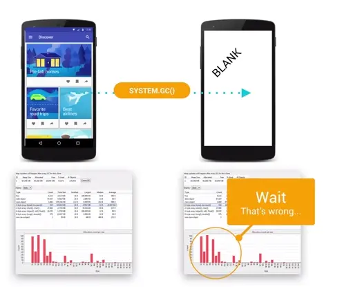 寻找内存泄漏并修复这个漏洞是件很棘手的事情,你需要对执行的代码很熟悉,清楚的知道在特定环境下是如何运行的,然后仔细排查。例如,你想知道程序 中的某个activity退出的时候,它之前所占用的内存是否有完整的释放干净了?首先你需要在activity处于前台的时候使用Heap Tool获取一份当前状态的内存快照,然后你需要创建一个几乎不这么占用内存的空白activity用来给前一个Activity进行跳转,其次在跳转到 这个空白的activity的时候主动调用System.gc()方法来确保触发一个GC操作。最后,如果前面这个activity的内存都有全部正确释 放,那么在空白activity被启动之后的内存快照中应该不会有前面那个activity中的任何对象了。
