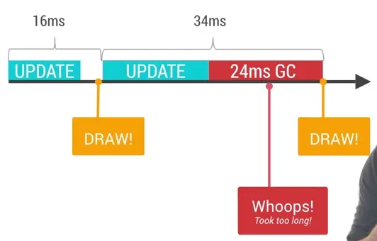 通常来说,单个的GC并不会占用太多时间,但是大量不停的GC操作则会显著占用帧间隔时间(16ms)。如果在帧间隔时间里面做了过多的GC操作,那么自然其他类似计算,渲染等操作的可用时间就变得少了。