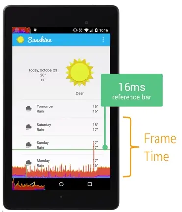 随着界面的刷新,界面上会滚动显示垂直的柱状图来表示每帧画面所需要渲染的时间,柱状图越高表示花费的渲染时间越长。