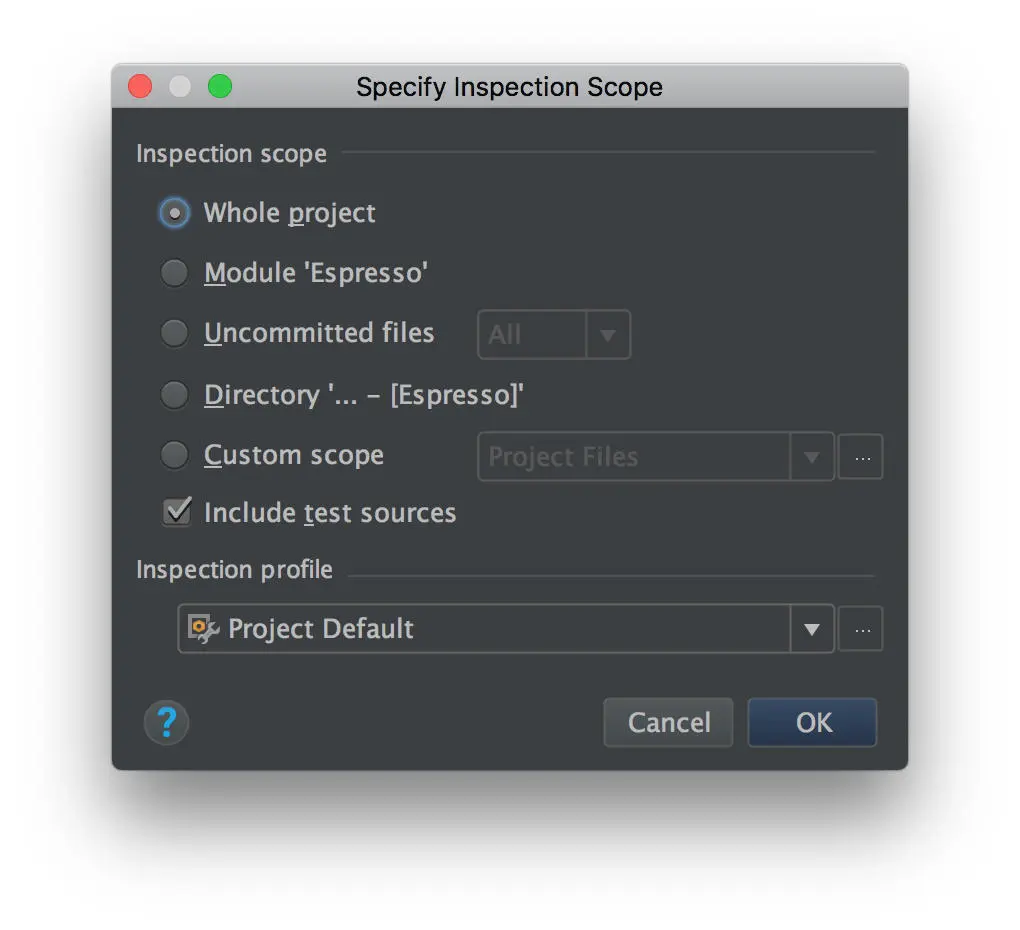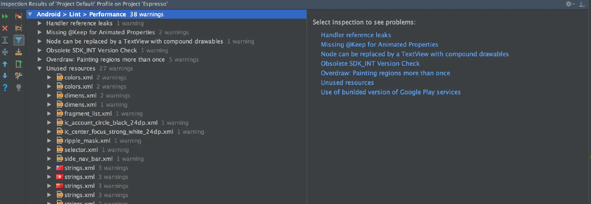 由于Proguard只对Java代码起作用,对于资源文件,它就无能为力了。这个时候,Lint就派上用场了。Lint是一个静态的代码分析器,我们可以通过在 Android Studio -> Analyze -> Inspect code... , 选择范围即可开始就检查。