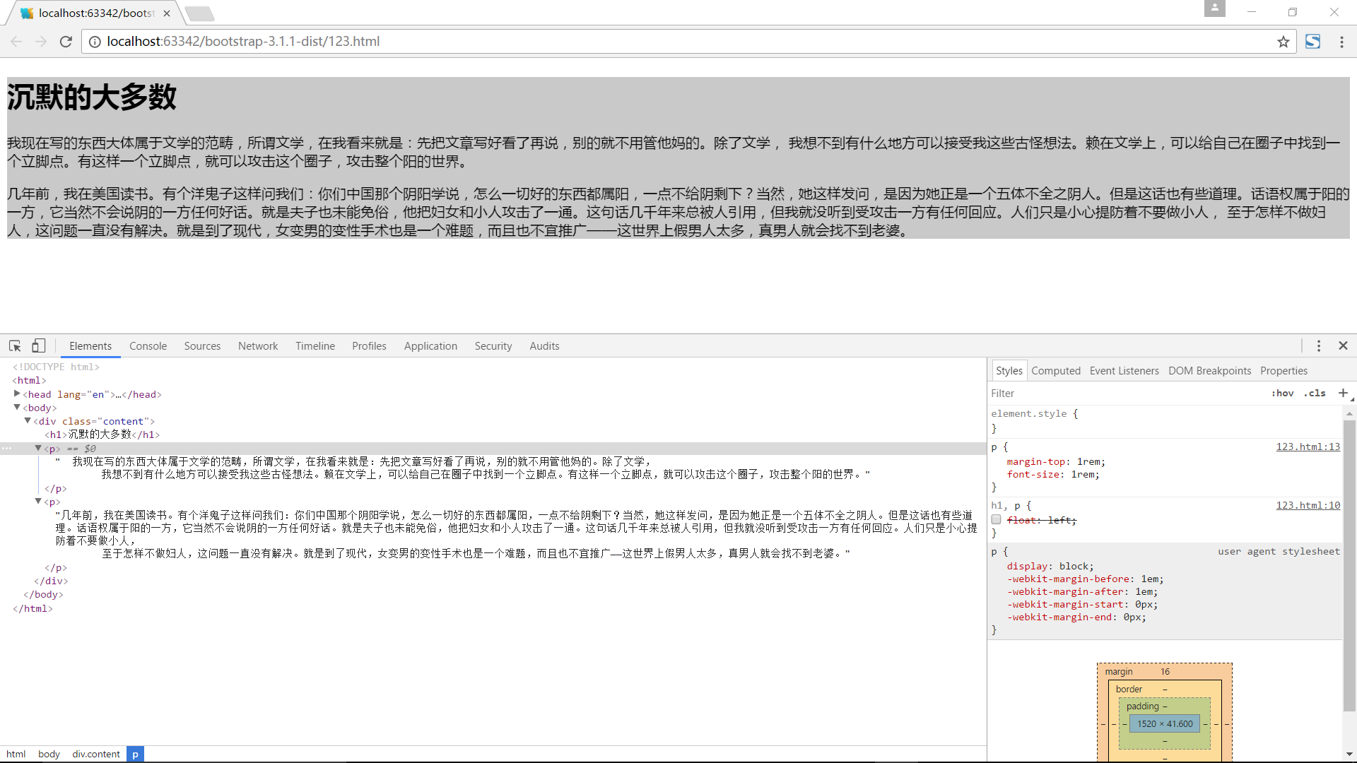 我们在父元素底部增加了一行空的<body> <div class="content"> <h1>沉默的大多数</h1> <p> 我现在写的东西大体属于文学的范畴,所谓文学,在我看来就是:先把文章写好看了再说,别的就不用管他妈的。除了文学, 我想不到有什么地方可以接受我这些古怪想法。赖在文学上,可以给自己在圈子中找到一个立脚点。有这样一个立脚点,就可以攻击这个圈子,攻击整个阳的世界。</p> <p>几年前,我在美国读书。有个洋鬼子这样问我们:你们中国那个阴阳学说,怎么一切好的东西都属阳,一点不给阴剩下?当然,她这样发问,是因为她正是一个五体不全之阴人。但是这话也有些道理。话语权属于阳的一方,它当然不会说阴的一方任何好话。就是夫子也未能免俗,他把妇女和小人攻击了一通。这句话几千年来总被人引用,但我就没听到受攻击一方有任何回应。人们只是小心提防着不要做小人, 至于怎样不做妇人,这问题一直没有解决。就是到了现代,女变男的变性手术也是一个难题,而且也不宜推广——这世界上假男人太多,真男人就会找不到老婆。</p> <div style="clear:both;"></div> </div> </body>div标签,并且为其设置了样式clear:both;,以下是修改后的效果: