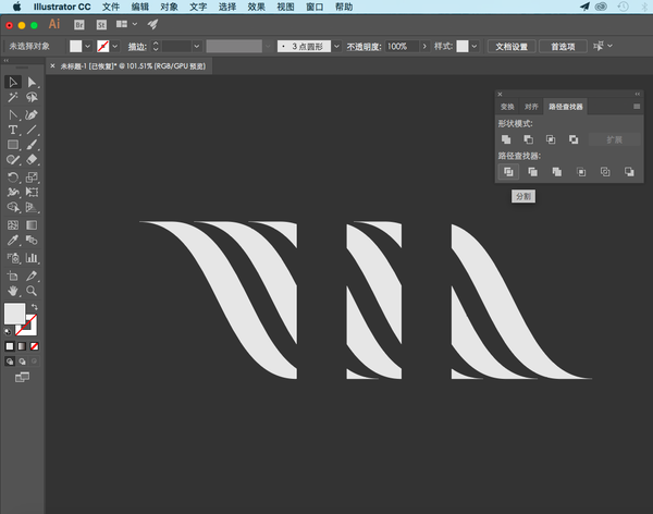 选中除背景外的所有元素,「窗口 -> 路径查找器 -> 分割」,将整体图形分割为三部分: