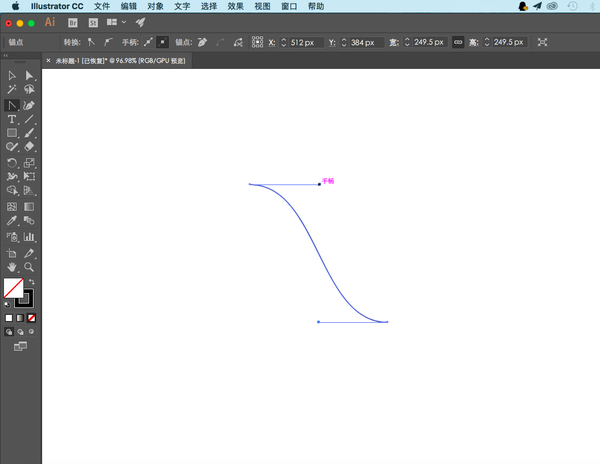 按住『shift 键』的同时用「锚点工具」拉动其中一个「手柄」,使「手柄」水平,并且端点位于过线段中点做的垂直线上,软件会给出如下图的提示(若没有,请设置「视图 -> 智能参考线」为开启):