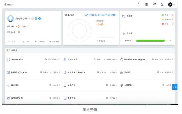 如图,个人信息、账单预览以及安全信息是页面的重点元素,因此在页面布局上进行了特异处理,与下面的已开通服务列表形成视觉上重点与次要元素的对比,包括增大元素面积、图形化处理、色彩特异处理等。