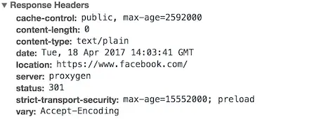 举个例子, 我们在 Chrome 浏览器中访问 Facebook 的主页 facebook.com, 然后打开开发者工具,可以看到服务端发送这样的相应: