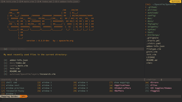 SpaceVim v0.3.0 新功能预览 已注销 2017-04-19 805 阅读1分钟 原文链接: zhuanlan.zhihu.com 在过去的几个版本中,SpaceVim 功能在不断的强化,支持的开发语言也越来越多,伴随着 v0.3.0 版本的即将到来,先简单说下这一版本增加的新功能: 快捷键导航系统(快捷键记忆辅助系统) 做这个系统的主要原因是,方便新用户上手,刚安装的 SpaceVim 含有非常多的快捷键。而新用户一脸茫然,完全不知道该怎么用。快捷键记忆辅助系统主要功能就是提示用户下一个按键的功能。比如按下空格键,如果此时用户忘记下一个按键是什么了,出现了输入停顿,那么以上的图片中的提示就会出现,告知用户,下一个按键的每一个功能,其中紫色的为一组功能,进入后还有其他可以选择。