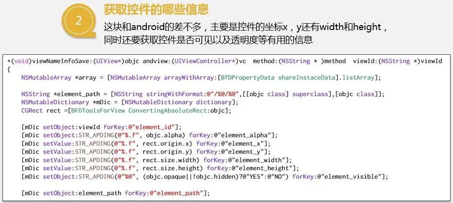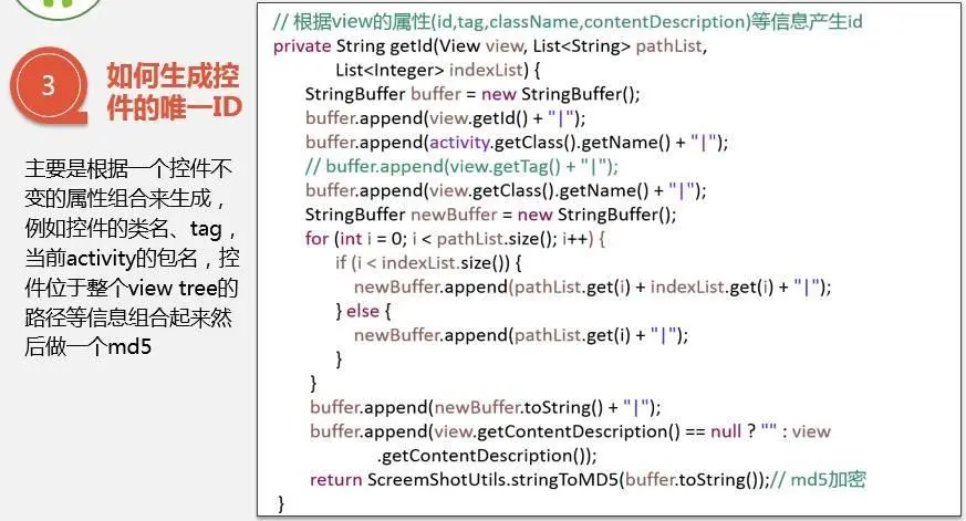 整个技术里面比较关键的一点是怎么拿到屏幕控件信息。这一块儿主要就是三个问题。第一,就是获取时机。第二,就是拿控件什么信息,什么信息是需要用到的。第三,就是比较关键的,如何生成控件的唯一ID,ID是在程序内部生成。需要保证在不同的手机上面,这些ID是一样的。还要保证每一次启动ID都是不变。