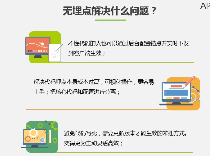 1、首先什么是无埋点呢,其实所谓无埋点就是开发者无需再对追踪点进行埋码,而是脱离代码,只需面对应用界面圈圈点点即可追加随时生效的事件数据点。