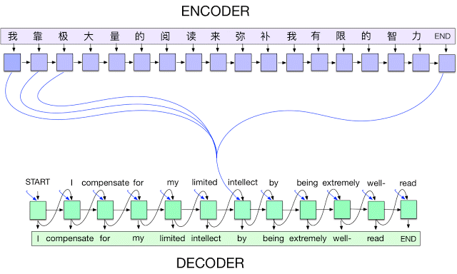 | 中译英 seq2seq 翻译模型。在每个时步,编码器接收一个中文字符及其之前的状态(黑色箭头),然后生成输出矢量(蓝色箭头)。然后,解码器逐字生成英语翻译,具体步骤是:在每个时步,解码器接收上一个字词及其之前的状态,并对编码器的所有输出(亦称作注意力 [3],用蓝色标示)进行加权组合,然后生成下一个英语单词。请注意,在实现过程中,我们使用词块 [4] 处理生僻词。 |