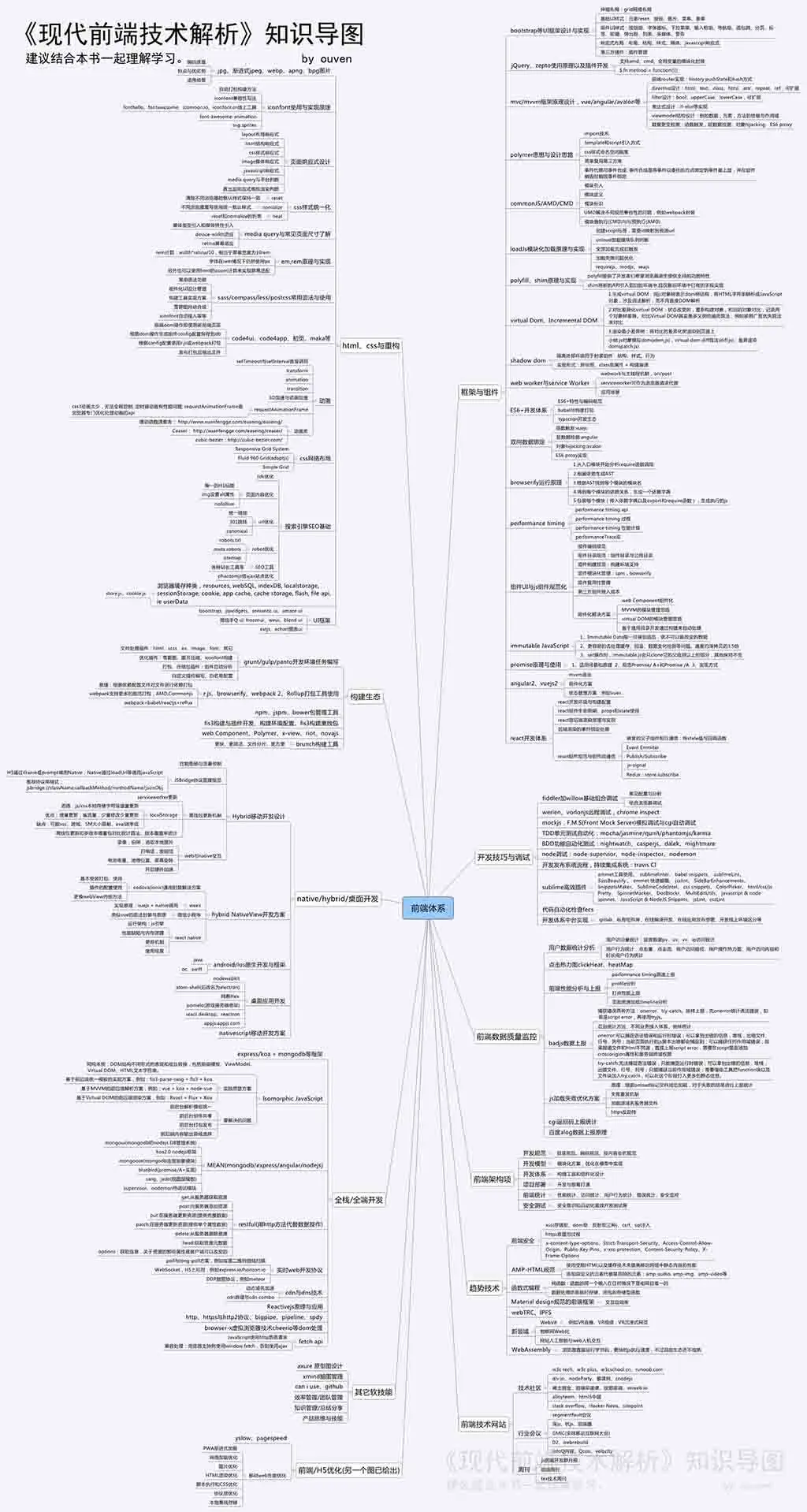 幸运的是,对于现代前端技术知识体系图,现在已经推出了《现代前端技术解析》一书,针对2017年~2018年前端技术知识体系内容深入原理,展开剖析,体系化、全面地帮助前端读者们解决了这些问题。我们不妨先来看看本书目录(打不开看 这个链接),再回头来看。