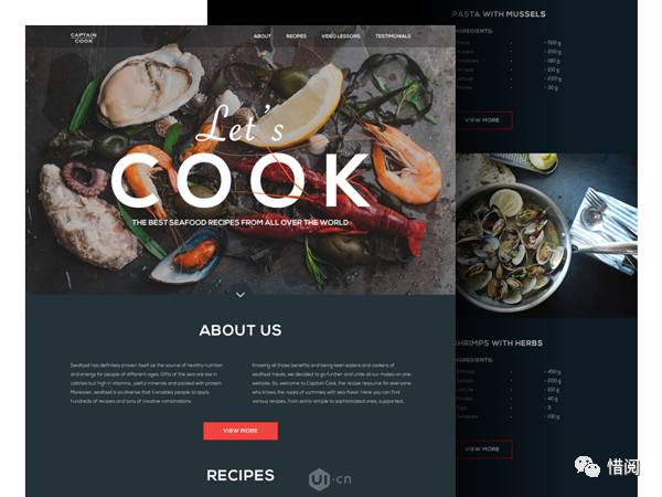 上面这个海鲜食品网站的登录页面我们可以看到,图片上面的那句“Let’s Cook”就是一个行为召唤元素。用户进入页面第一眼就可以看到这句话,接受到产品的主题。但是这文案本身不可交互,这个页面中可交互的行为召唤元素是页面底部的红色按钮。通过按钮上的标签View More,用户知道点击后就会看到更多特定主题的食品与菜单。红色的应用增强了页面的视觉层次结构,可以有效的吸引用户的目光。