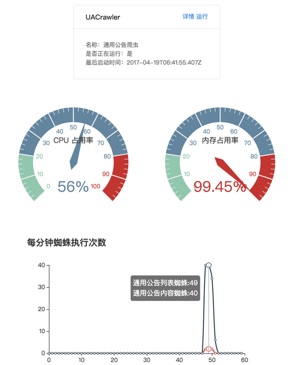 CrawlerServer 提供了 RESTful API 来返回当前爬虫的状态信息,我们可以利用 React 或者其他框架来快速搭建监控界面。