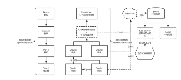 关注点分离,整个架构分为了爬虫调度 CrawlerScheduler、Crawler、Spider、dcEmitter、Store、KoaServer、MonitorUI 等几个部分,尽可能地分离职责。