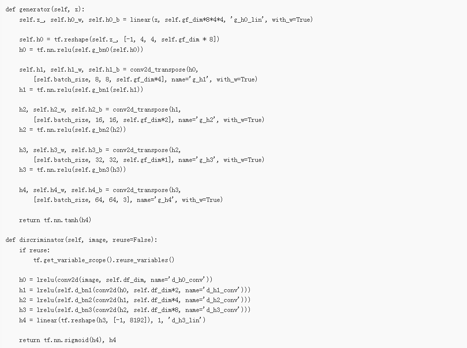 首先我们定义生成器和判别器结构。linear, conv2d_transpose, conv2d, 和 lrelu 函数在 ops.py 中定义。