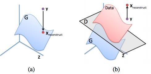 (a): 生成分布的 y 的理想重建(蓝色曲面)。 (b):尝试通过对 D(y) 最大化来重建 y 的一个失败的例子。图像来自图像修复论文