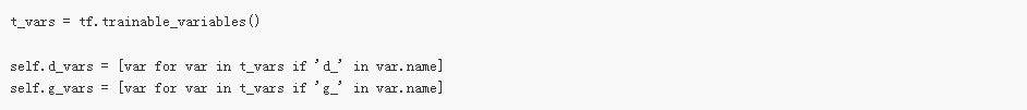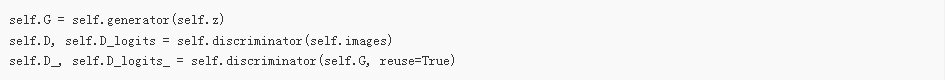当我们初始化这个类的时候,将要用到这两个函数来构建模型。我们需要两个判别器,它们共享(复用)参数。一个用于来自数据分布的小批图像,另一个用于生成器生成的小批图像。
