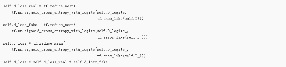接下来,我们定义损失函数。这里我们不用求和,而是用D的预测值和真实值之间的交叉熵(cross entropy),因为它更好用。判别器希望对所有“真”数据的预测都是1,对所有生成器生成的“伪”数据的预测都是0。生成器希望判别器对两者的预测都是1 。