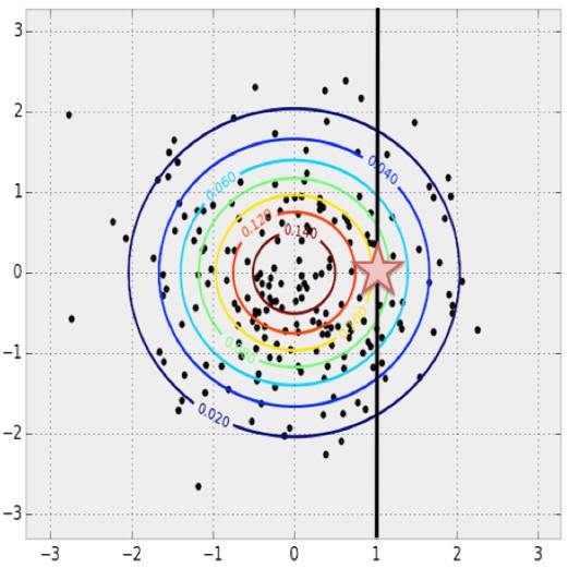 2维图像的PDF和采样。 PDF 用等高线图表示,样本点画在上面