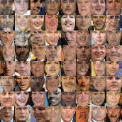 选择一些用于图像补全的图片,将它们放到 dcgan-completion.tensorflow/your-test-data/raw 。然后像之前 dcgan-completion.tensorflow/your-test-data/aligned 那样排列整齐。 这里我从LFW中随机抽出一些图像。 我的DCGAN没有使用LFW的图像来训练。