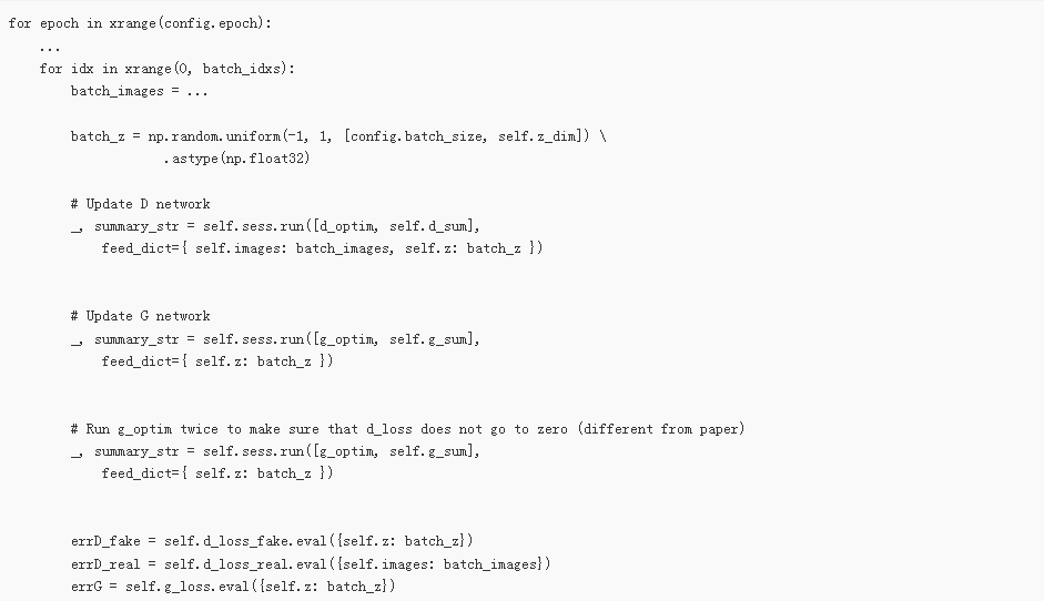 下面我们遍历数据。每一次迭代,我们采样一个小批数据,然后使用优化器来更新网络。有趣的是,如果G只更新一次,鉴别器的损失不会变成0。另外,我认为最后调用 d_loss_fake 和 d_loss_real 进行了一些不必要的计算, 因为这些值在 d_optim 和 g_optim 中已经计算过了。 作为Tensorflow 的一个联系,你可以试着优化这一部分,并发送PR到原始的repo。