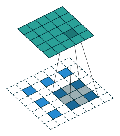 微步长卷积运算图示,蓝色是输入,绿色是输出