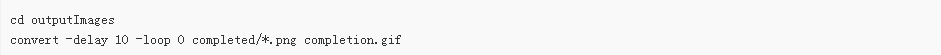 这段代码会生成图像,并周期性地将图像输出在 —outDir 文件夹中。 你可以使用ImageMagick来生成一个gif: