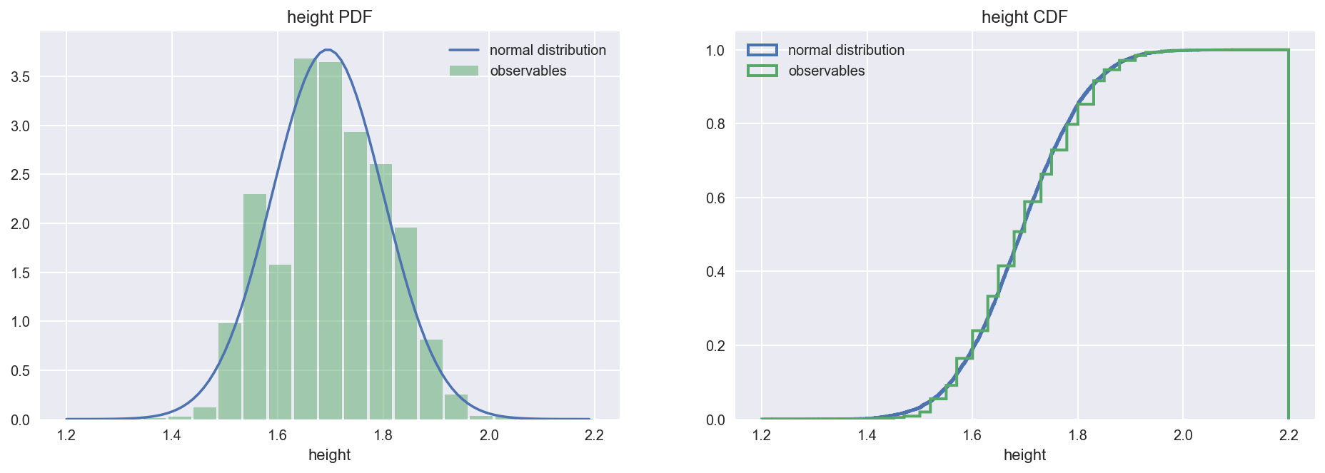 plot_pdf_cdf(data=height, xbins=21, xrange=(1.2, 2.2), xlabel='height')