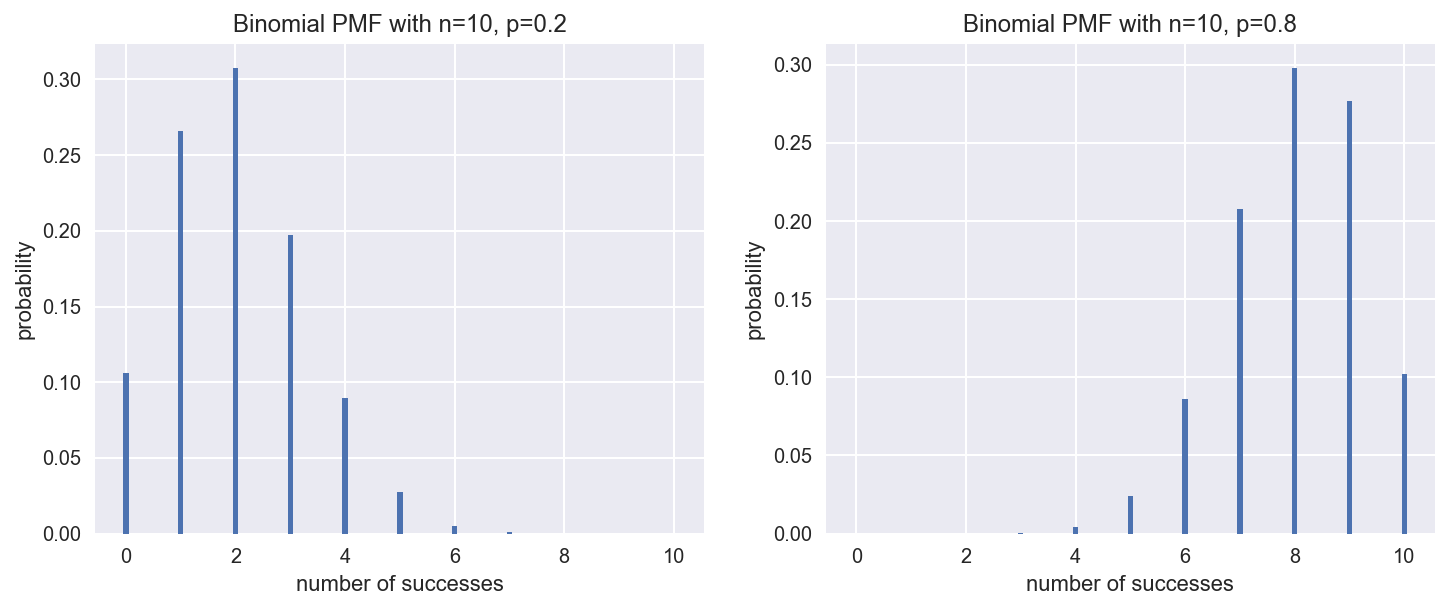 这时的分布不再对称了,正如我们所料,当概率p=0.2时,正面最有可能出现2次;而当p=0.8时,正面最有可能出现8次。
