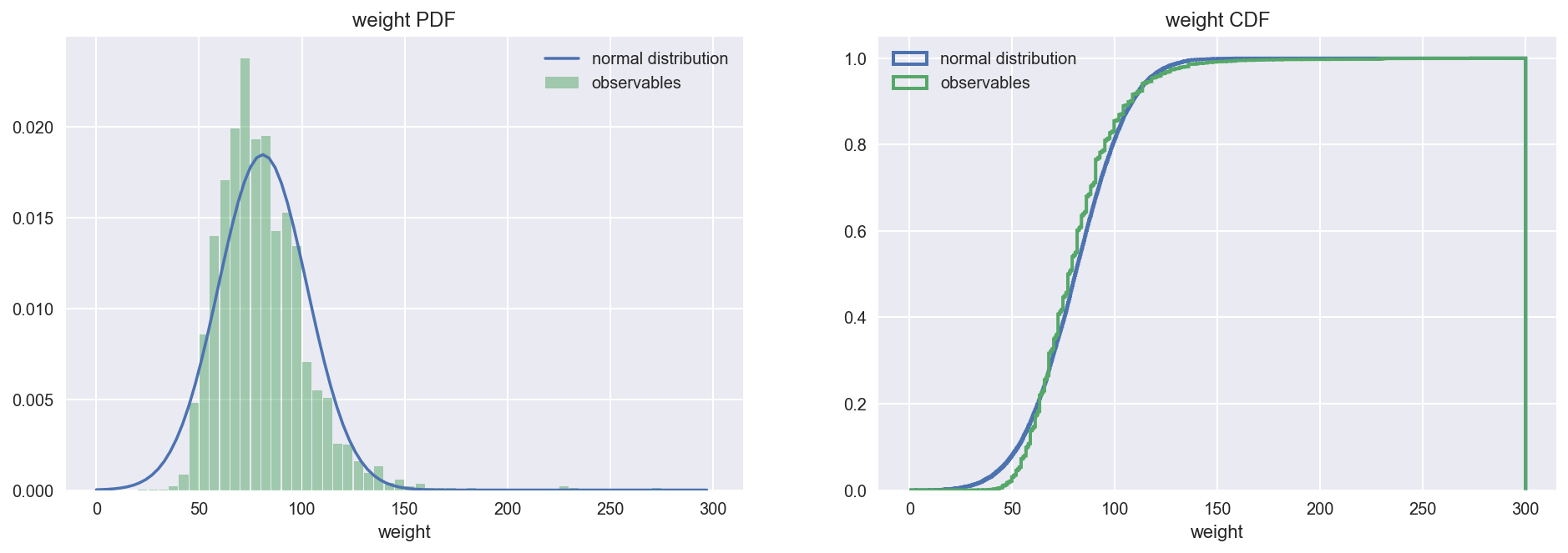 weight = df.weight.dropna() def plot_pdf_cdf(data, xbins, xrange, xlabel):