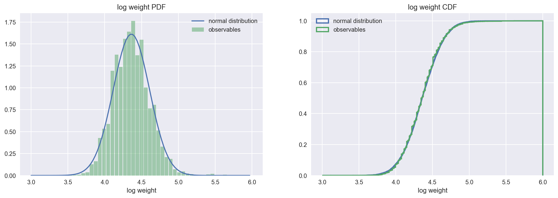 plot_pdf_cdf(data=log_weight, xbins=53, xrange=(3,6), xlabel='log weight')