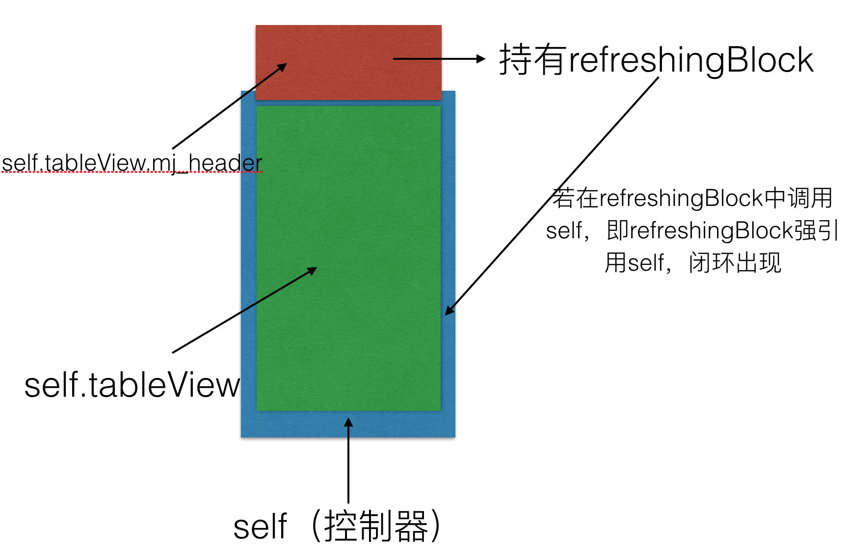 若在MJRefresh的执行Block中调用当前self或其所属属性,一定要注意循环引用问题。我们简单分析下MJRefresh为什么会造成循环引用问题: