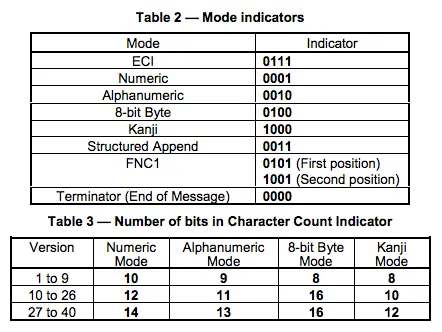 Numeric mode 数字编码,从0到9。如果需要编码的数字的个数不是3的倍数,那么,最后剩下的1或2位数会被转成4或7bits,则其它的每3位数字会被编成 10,12,14bits,编成多长还要看二维码的尺寸(下面有一个表Table 3说明了这点)
