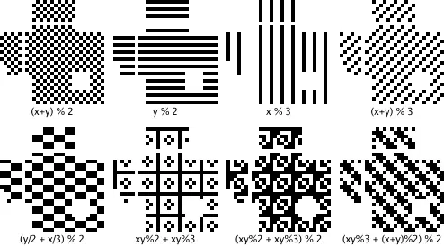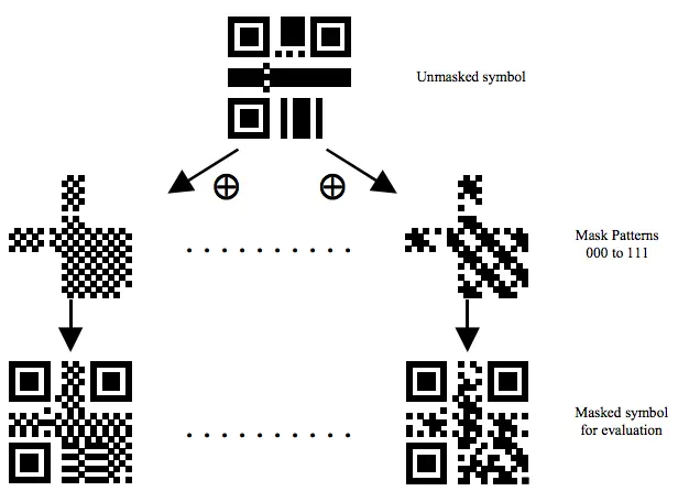 这样下来,我们的图就填好了,但是,也许那些点并不均衡,如果出现大面积的空白或黑块,会告诉我们扫描识别的困难。所以,我们还要做Masking操作(靠,还嫌不复杂)QR的Spec中说了,QR有8个Mask你可以使用,如下所示:其中,各个mask的公式在各个图下面。所谓mask,说白了,就是和上面生成的图做XOR操作。Mask只会和数据区进行XOR,不会影响功能区。(注:选择一个合适的Mask也是有算法的)