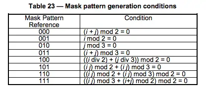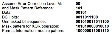 - 5个数据bits:其中,2个bits用于表示使用什么样的Error Correction Level, 3个bits表示使用什么样的Mask