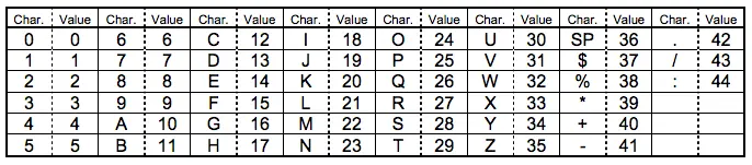 Alphanumeric mode 字符编码。包括 0-9,大写的A到Z(没有小写),以及符号$ % * + – . / : 包括空格。这些字符会映射成一个字符索引表。如下所示:(其中的SP是空格,Char是字符,Value是其索引值) 编码的过程是把字符两两分组,然后转成下表的45进制,然后转成11bits的二进制,如果最后有一个落单的,那就转成6bits的二进制。而编码模式和字符的个数需要根据不同的Version尺寸编成9, 11或13个二进制(如下表中Table 3)