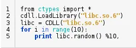 好了, 现在你决定为了性能使用本地代码. 在标准的ctypes模块中, 你可以直接加载已编程的二进制库(.dll 或 .so文件)到Python中, 无需担心编写C/C++代码或构建依赖. 例如, 我们可以写个程序加载libc来生成随机数.