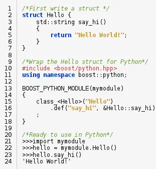 然而, 绑定ctypes的开销是非轻量级的. 你可以认为ctypes是一个粘合操作系库函数或者硬件设备驱动的胶水. 有几个如 SWIG, Cython和Boost 此类Python直接植入的库的调用比ctypes开销要低. Python支持面向对象特性, 如类和继承. 正如我们看到的例子, 我们可以保留常规的C++代码, 稍后导入. 这里的主要工作是编写一个包装器 (行 10~18).