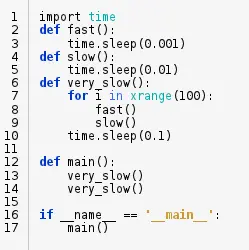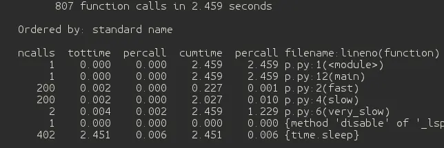 我们写了个测试程序. 基于黑盒监控. 这里的瓶颈是 "very_slow()" 函数调用. 我们还可以看到 "fast()" 和 "slow()"都被调用200次. 这意味着, 如果我们可以改善 "fast()" 和 "slow()" 函数, 我们可以获得全面的性能提升. cprofiles 模块也可以在运行时导入. 这对于检查长时间运行的进程非常有用.