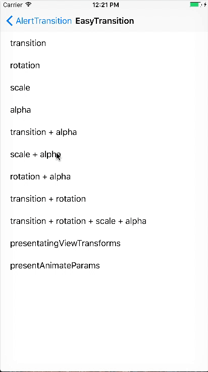EasyTransition is a subclass of AlertTransition, with it, you can compose custom transition with translation, scale, rotation and alpha. You can also change background with custom color or UIBlurEffect. It support changing device orientation. And it is easy to use both in code or storyboard.
