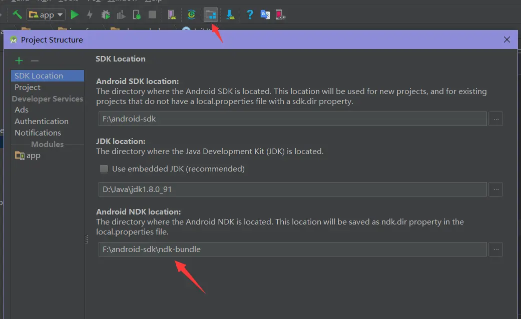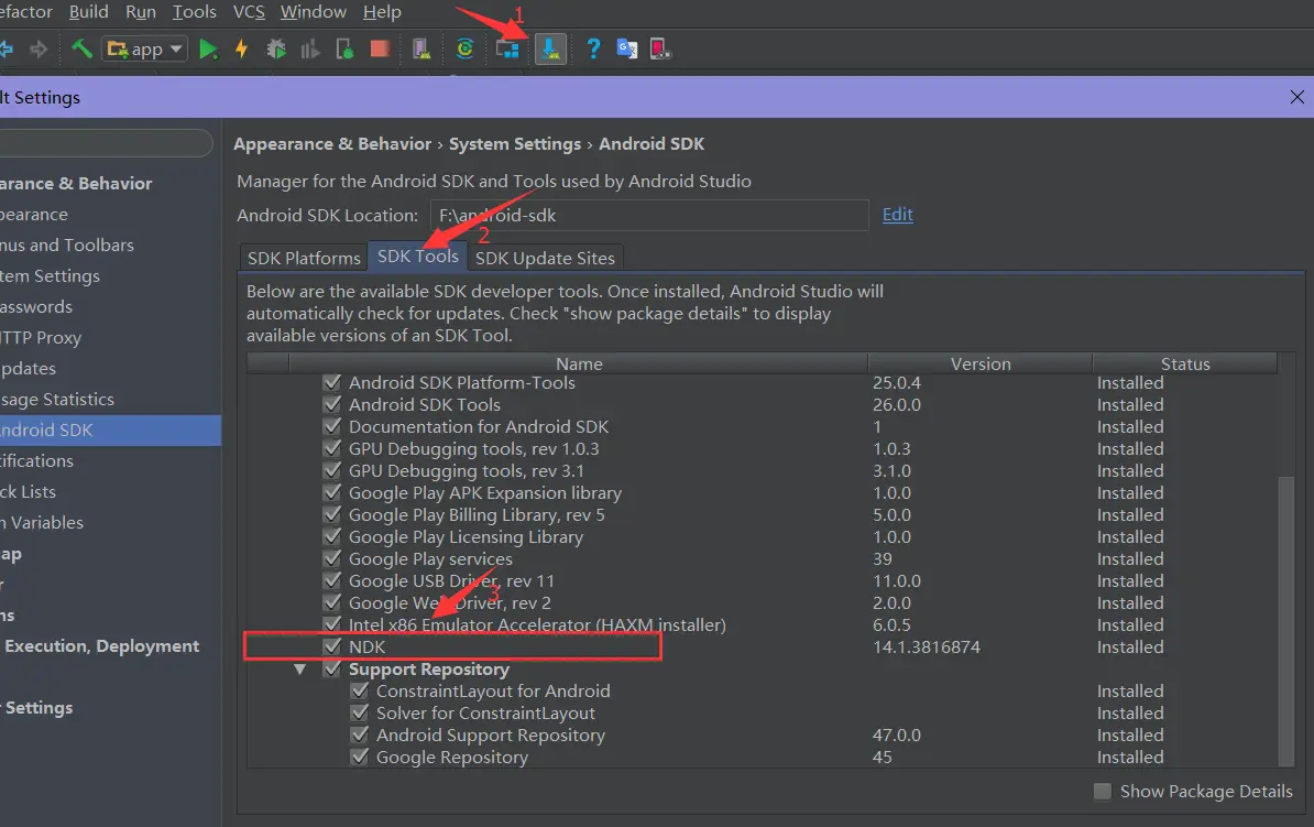 因为我是用的第二种方式,所以 NDK 直接下在了 android-sdk 中,具体情况请根据自己的文件位置而定