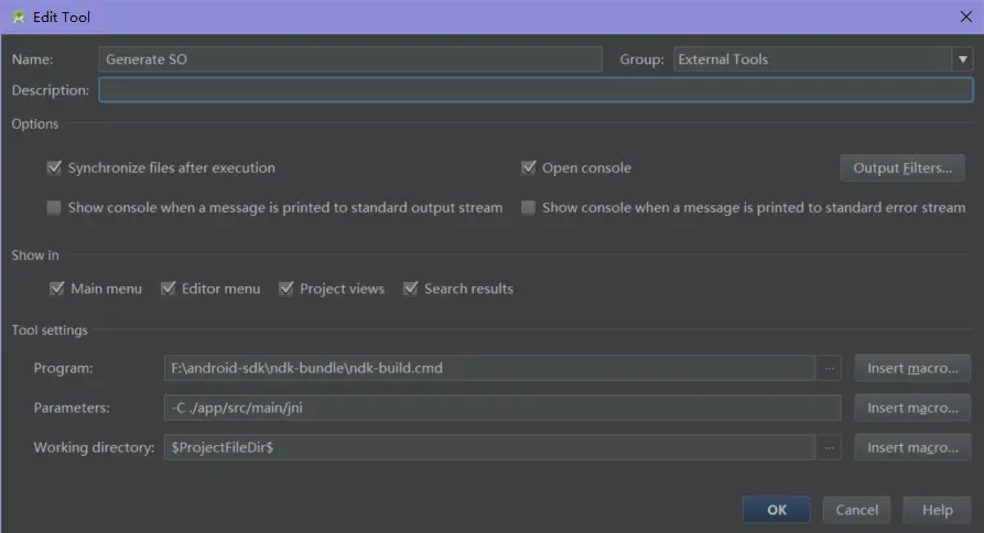 但是发现每次生成 so 库时都要手动切换路径然后生成文件,虽然说没有之前生成头文件那么复杂,但是这种重复的操作还是有点麻烦,那么为了简化这个步骤,下面就要利用到上面提到过的 External Tool 了